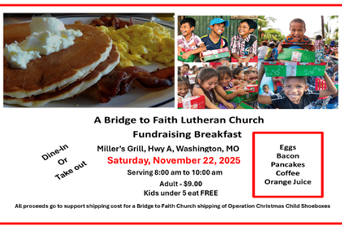 Enjoy breakfast Saturday, November 22nd from 8-10 am and all proceeds will go towards the shipping costs of our shoeboxes!